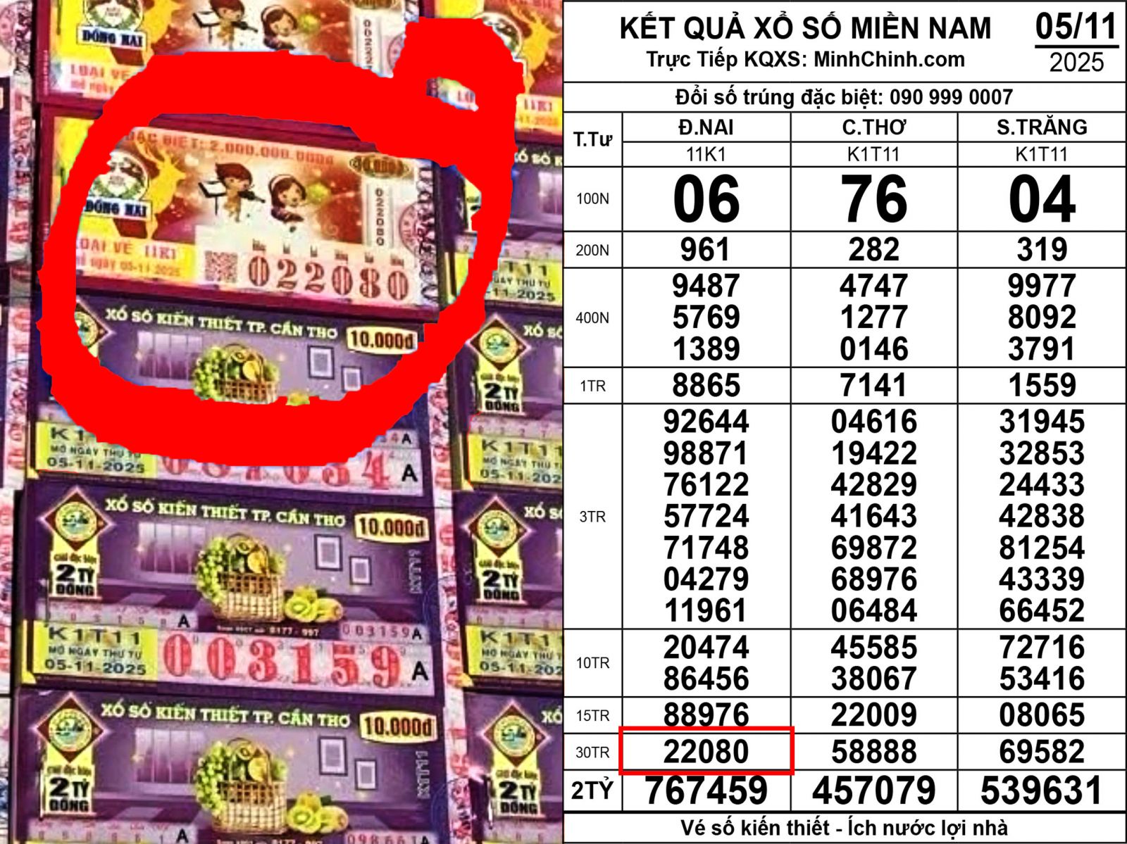Đại lý Chấn Nam ở Cần Thơ (Hậu Giang cũ) xác nhận đã đổi thưởng cho khách trúng 1 tờ độc đắc trị giá 2 tỉ đồng30 tờ giải an ủi trị giá 1,5 tỉ đồng của đài Kiên Giang (kỳ quay ngày 2/11).