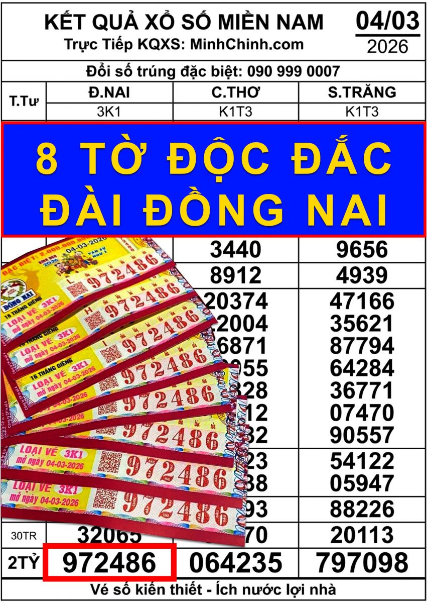 Theo thông tin từ các đại lý, vé số Đồng Nai mở thưởng ngày 4-3 với dãy số đặc biệt 972486 được xác định trúng tại TP.HCM.