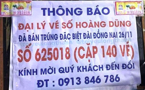 “Đại lý vé số Hoàng Dũng đã bán trúng đặc biệt đài Đồng Nai 26.11 số 625018 (cặp 140 vé), kính mời quý khách đến đổi thưởng”.