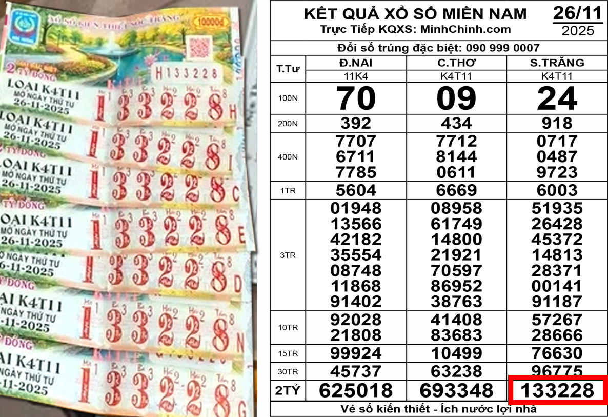 7 tờ trúng độc đắc theo kết quả xổ số miền Nam ngày 26 tháng 11