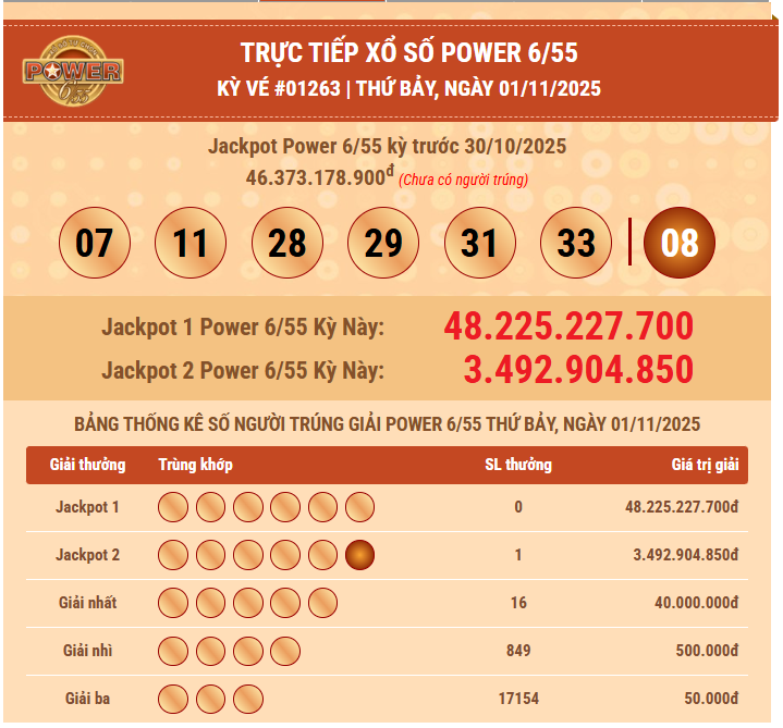 Vietlott Power 6/55 đang trở thành tâm điểm của cộng đồng yêu xổ số khi giải Jackpot 1 chính thức vượt mốc 50,35 tỷ đồng (kỳ quay thưởng ngày 4/11). Đây được xem là mức thưởng “khủng”, mở ra cơ hội đổi đời cho hàng triệu người chơi trên toàn quốc.