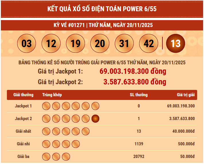 Jackpot 1 vượt 69 tỉ, Vietlott Power 6/55 ngày 20/11 ghi nhận 1 người trúng Jackpot 2