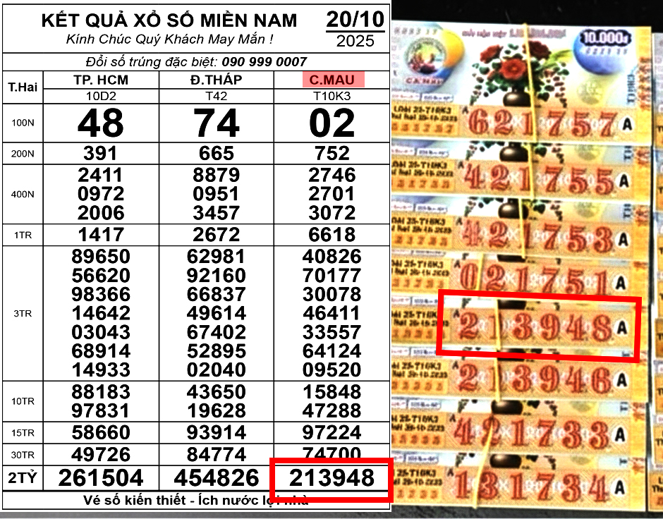Theo kết quả xổ số Cà Mau ngày 20.10, dãy số trúng độc đắc là 213948, mỗi tờ có giá trị giải thưởng 2 tỉ đồng, tổng cộng 14 tờ lên đến 28 tỉ đồng (chưa trừ thuế).