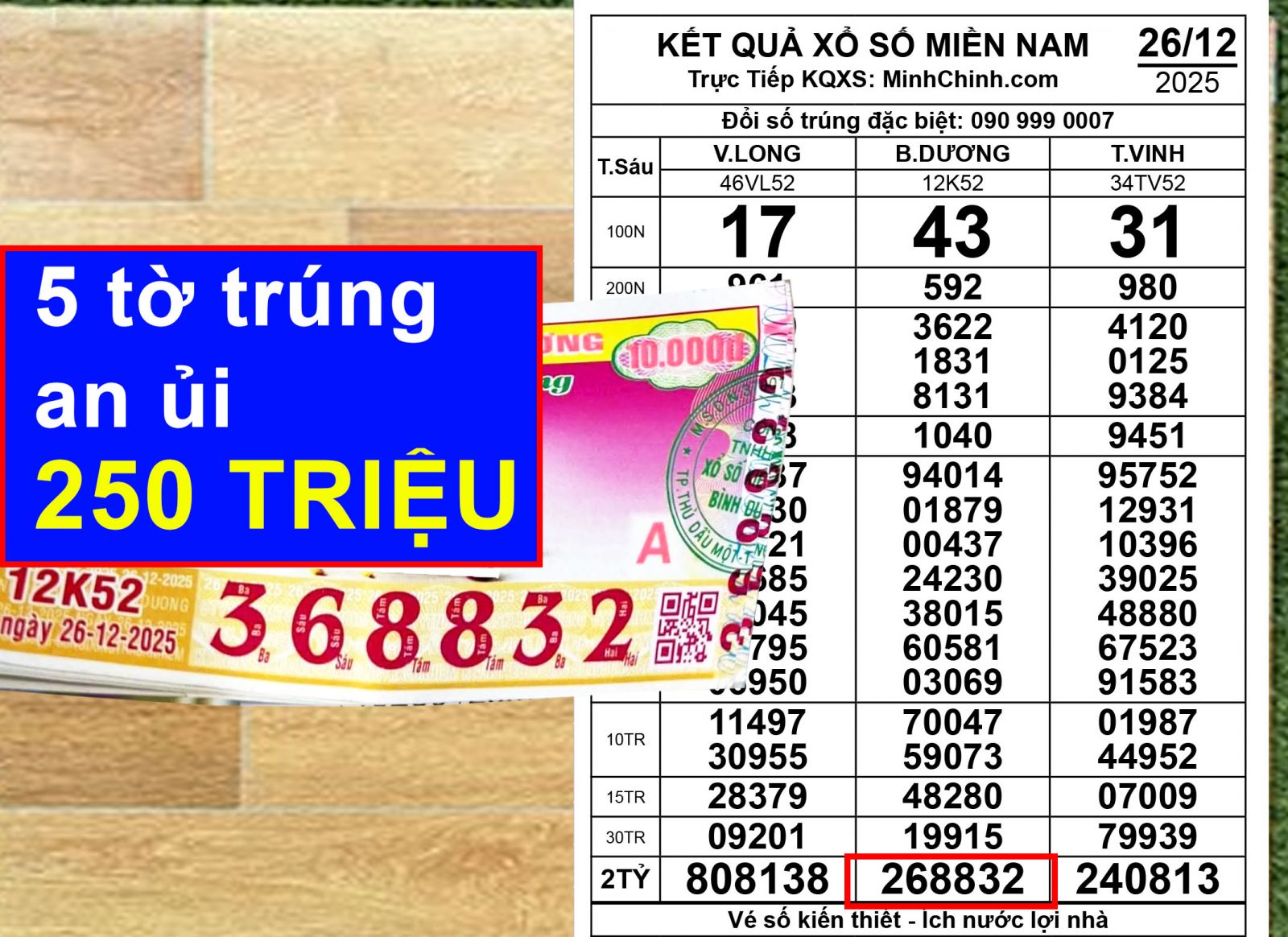 Theo thông tin từ đại lý vé số Thúy Hòa (phường Thủ Dầu Một, TP.HCM), đơn vị này vừa hỗ trợ đổi thưởng cho một khách hàng sở hữu 5 tờ vé số trúng giải an ủi. Những tờ vé trên mang dãy số 368832, thuộc đài Bình Dương mở thưởng xổ số miền Nam ngày 26-12. Mỗi tờ trúng 50 triệu đồng, tổng giá trị giải thưởng là 250 triệu đồng (chưa trừ thuế). Trong kỳ quay này, giải độc đắc của đài Bình Dương thuộc về dãy số 268832.