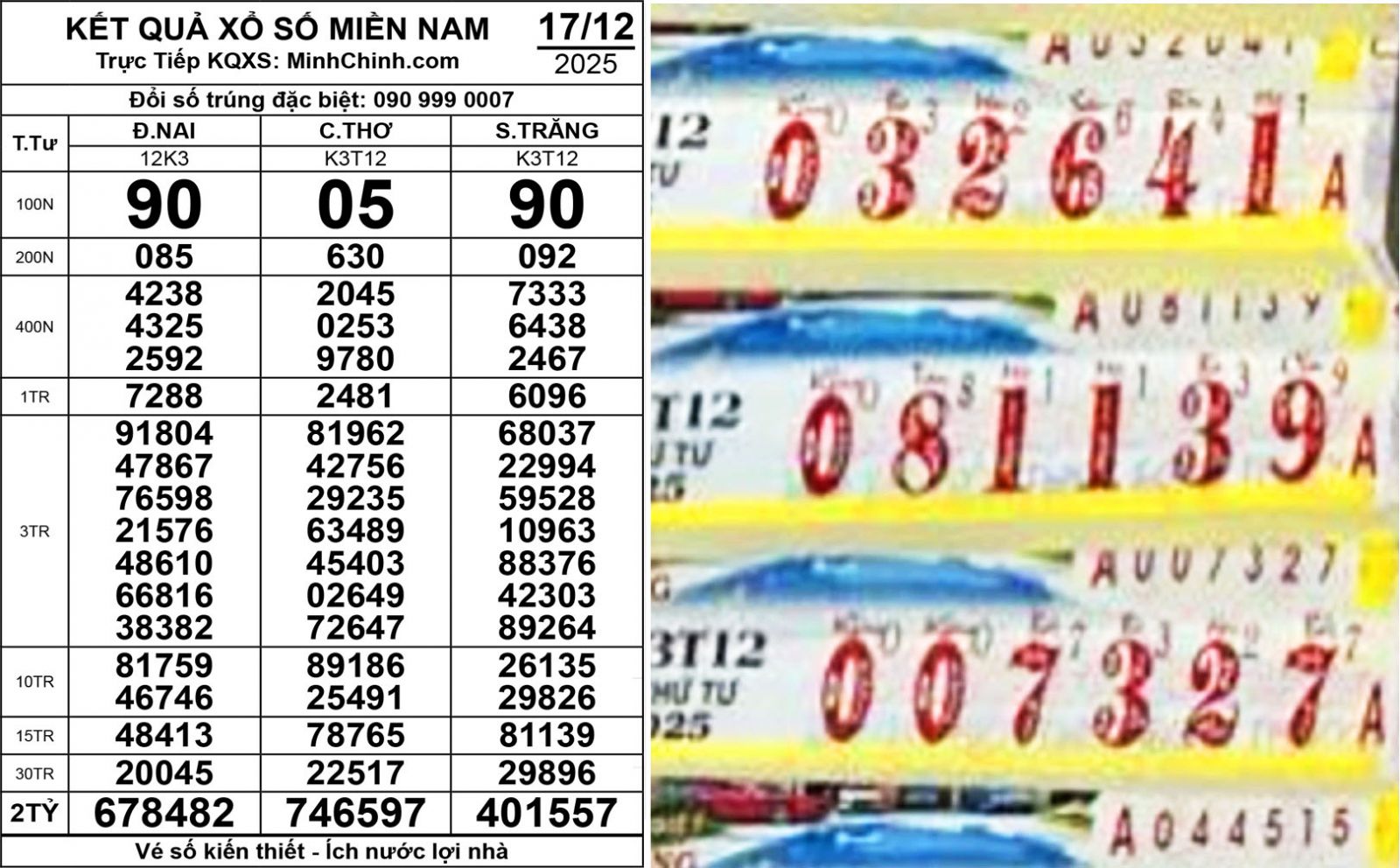 Theo kết quả công bố, giải độc đắc đài Đồng Nai thuộc về dãy số 678482, trong khi đài Sóc Trăng xác định vé trúng giải đặc biệt mang dãy số 401557. Cùng ngày, đài Cần Thơ cũng tìm được chủ nhân giải độc đắc với dãy số 746597.