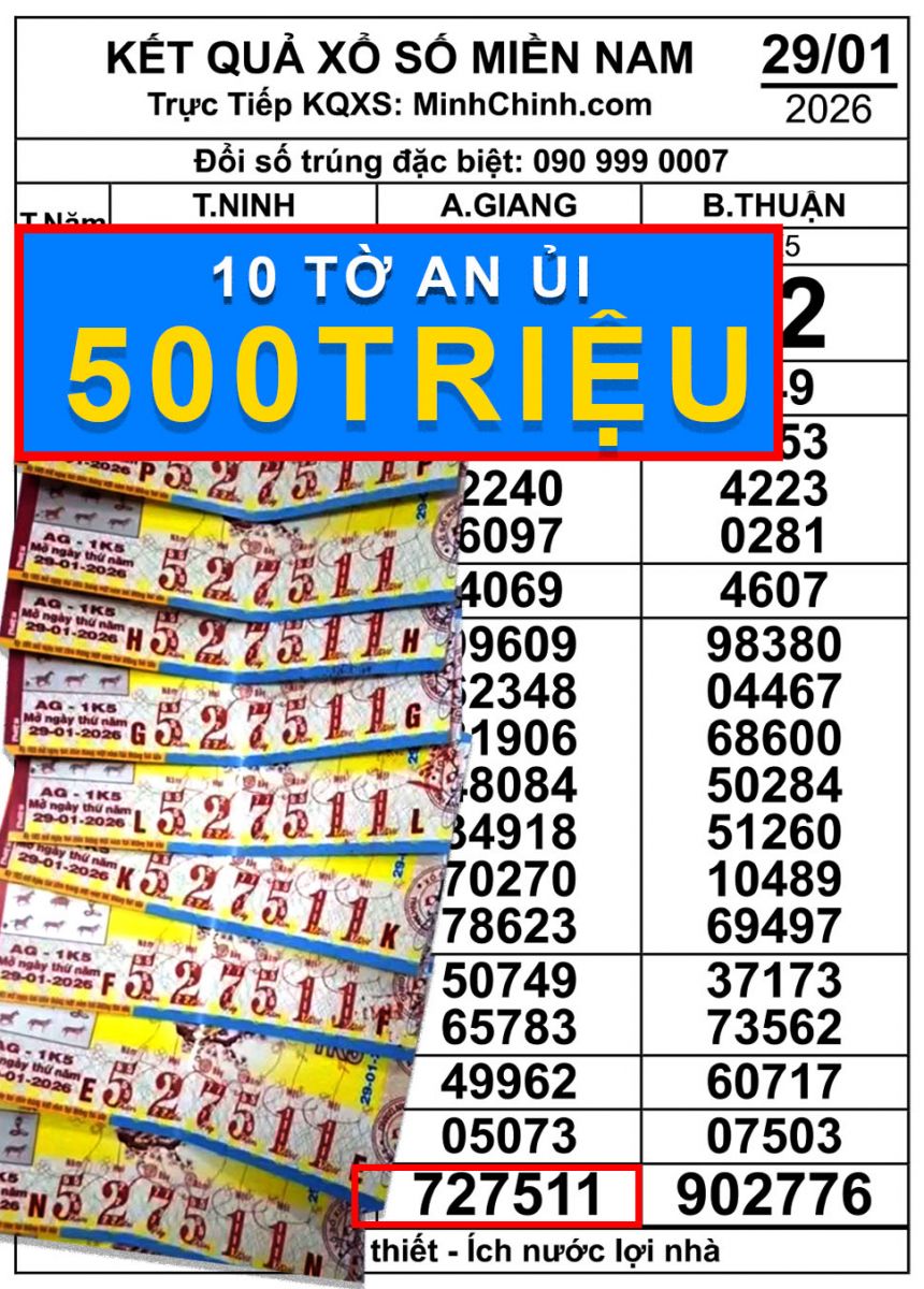 Theo xác nhận từ đại lý vé số Gia Huy tại khu vực Tây Ninh (Long An cũ), đơn vị này đã hoàn tất đổi thưởng cho 10 tờ vé số trúng giải an ủi của đài An Giang, với tổng giá trị giải thưởng 500 triệu đồng (chưa trừ thuế). Các vé trúng thưởng mang dãy số 527511, thuộc kỳ mở thưởng xổ số miền Nam ngày 29 tháng 1. Đại lý cho biết số vé này được bán lẻ cho nhiều khách hàng khác nhau và đã được đổi thưởng tại khu vực huyện Đức Hòa theo đúng quy trình.