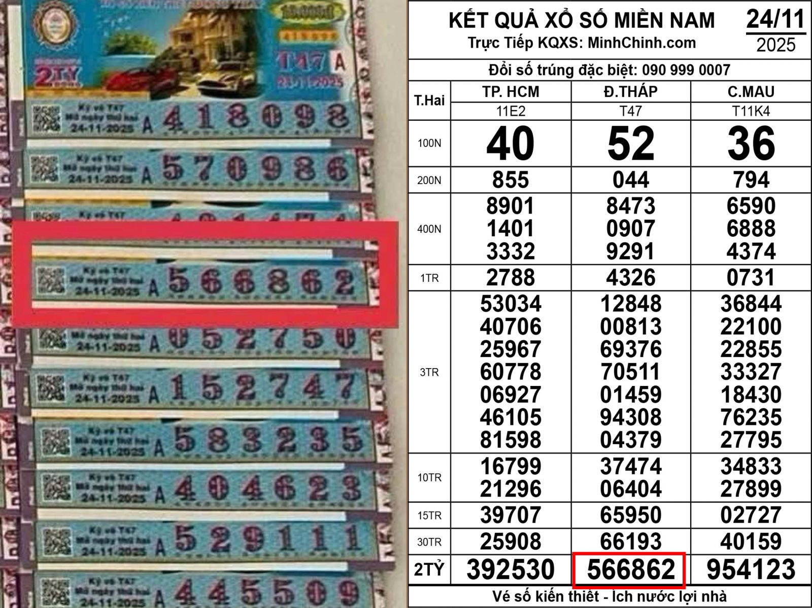 Cây vé trúng xổ số miền Nam ngày 24 tháng 11