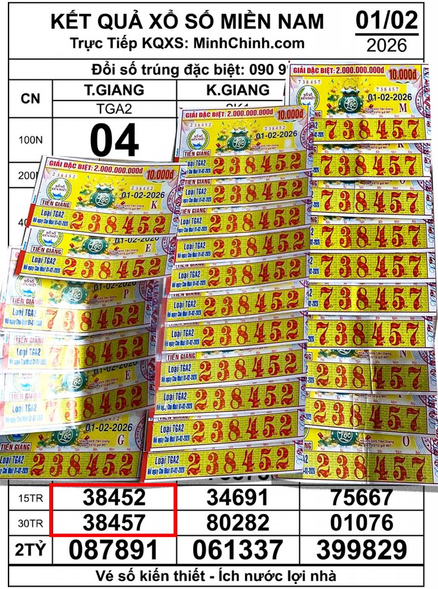 Đại lý vé số Toàn Phát tại Đồng Tháp (Tiền Giang cũ) cho biết vừa đổi thưởng hàng loạt vé trúng cho khách hàng địa phương. Cụ thể, có 10 tờ vé số mang dãy số cuối 38457, thuộc đài Tiền Giang mở thưởng xổ số miền Nam ngày 1-2, trúng giải nhất, mỗi tờ trị giá 300 triệu đồng (chưa trừ thuế). Bên cạnh đó, đại lý này cũng đổi thêm 17 tờ vé số có dãy số cuối 38452, cùng thuộc đài Tiền Giang, trúng giải nhì, mỗi tờ trị giá 255 triệu đồng (chưa trừ thuế).