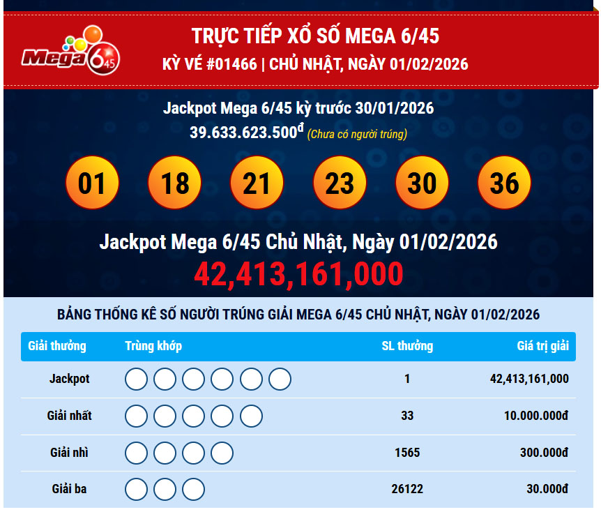 Theo thông báo từ Vietlott, vào lúc 18 giờ 30 ngày 1.2, kết quả quay số mở thưởng kỳ #1466 của loại hình Mega 6/45 đã xác định được một vé trúng giải Jackpot với giá trị lên đến 42.413.161.000 đồng.