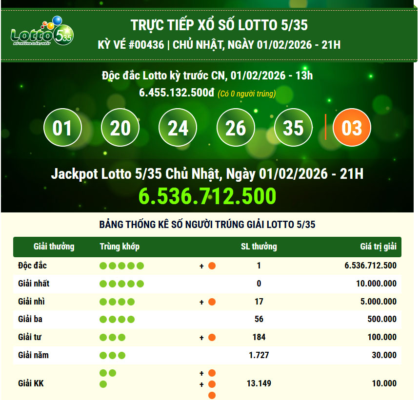 Không chỉ Mega 6/45, Lotto 5/35 trong cùng ngày cũng ghi nhận một vé trúng giải Độc đắc với giá trị 6.536.712.500 đồng, theo kết quả quay số mở thưởng kỳ #436, diễn ra lúc 21 giờ ngày 1.2.