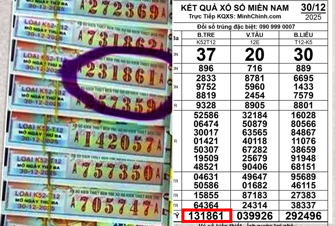 Theo ghi nhận, hình ảnh cọc vé trúng giải phụ đặc biệt đài Bến Tre được một đại lý vé số Đại Lộc tại Tây Ninh (Long An cũ) bán trúng cho khách đã được chia sẻ rộng rãi trên mạng xã hội. Những tờ vé mang dãy số 231861 trúng giải phụ đặc biệt, với giá trị 50 triệu đồng mỗi tờ. Trong khi đó, giải độc đắc xổ số Bến Tre ngày 30/12 thuộc về các tờ vé có dãy số 131861.
