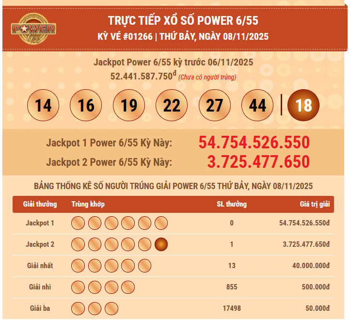 Tối ngày 08/11/2025, Công ty Xổ số điện toán Việt Nam (Vietlott) đã tiến hành quay số mở thưởng kỳ #01266 loại hình Power 6/55.