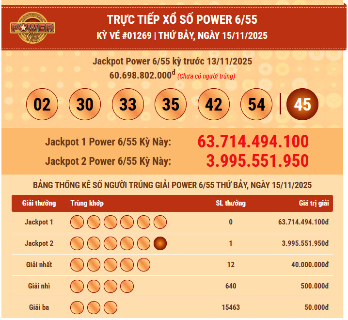 Tối 15/11, không khí dò vé Power 6/55 trở nên sôi động khi Vietlott công bố kết quả kỳ quay 01269. Trong lần quay này, hệ thống ghi nhận một khách hàng trúng Jackpot 2, nhận về khoản thưởng lên đến 3.995.551.950 đồng – con số đủ để đổi đời với bất kỳ ai.