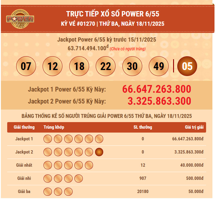 Tối 18.11, Vietlott đã công bố kết quả kỳ quay số mở thưởng Power 6/55 kỳ 01268, ghi nhận việc không có người trúng giải Jackpot 1, khiến giá trị giải thưởng tiếp tục tăng mạnh lên 66.647.263.800 đồng.