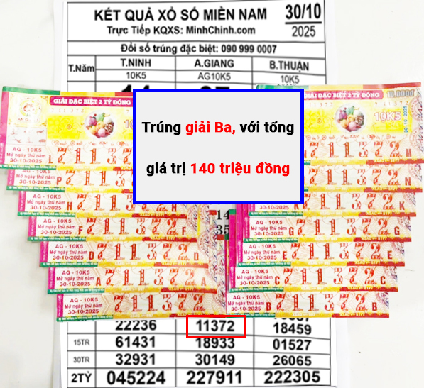 Cụ thể, 14 tờ vé có 5 số cuối 11372 – trúng giải Ba, với tổng giá trị 140 triệu đồng (chưa trừ thuế).