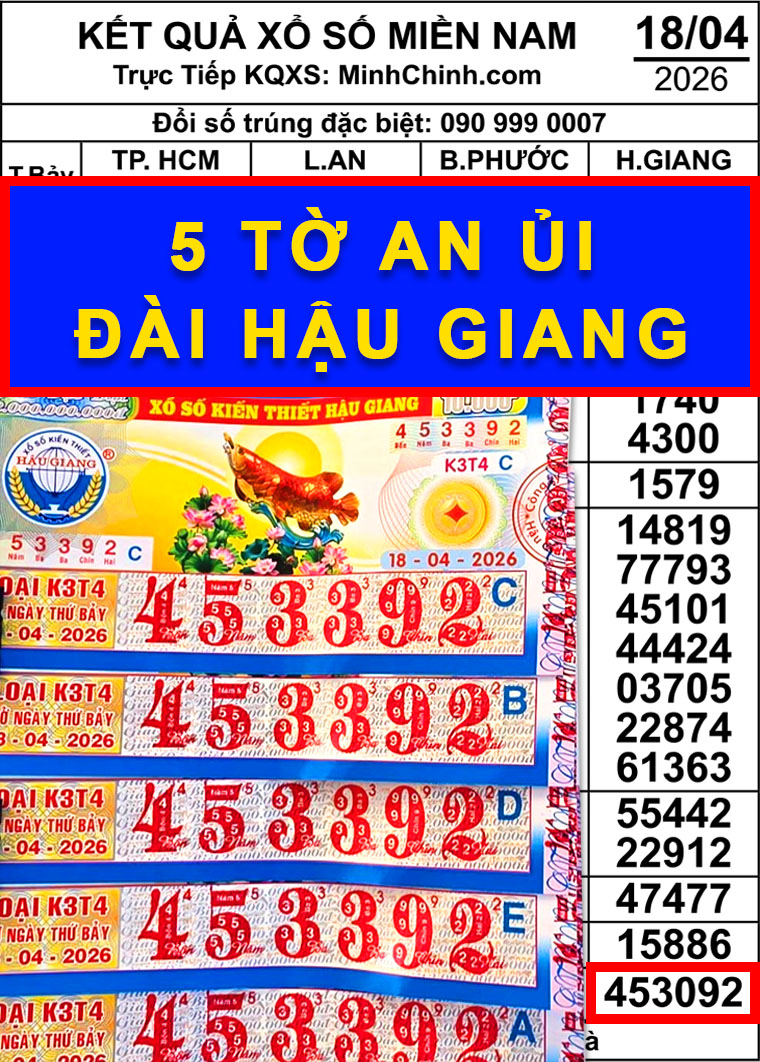 Trong khi đó, vé số Hậu Giang với dãy số độc đắc 453092 hiện vẫn chưa xác định được nơi có khách hàng trúng thưởng. Dù vậy, giải an ủi của vé số Hậu Giang đã được xác định trúng tại tỉnh Cà Mau. Nơi đổi thưởng là đại lý vé số Hổ.