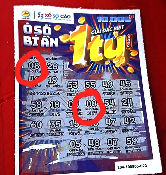 Tờ vé mang mã 204, thuộc trò chơi "Ô số bí ẩn". Khi cào, số 08 ở ô số của người chơi trùng với số 08 trong ô số trúng thưởng, mang về 1 tỉ đồng (chưa trừ thuế).