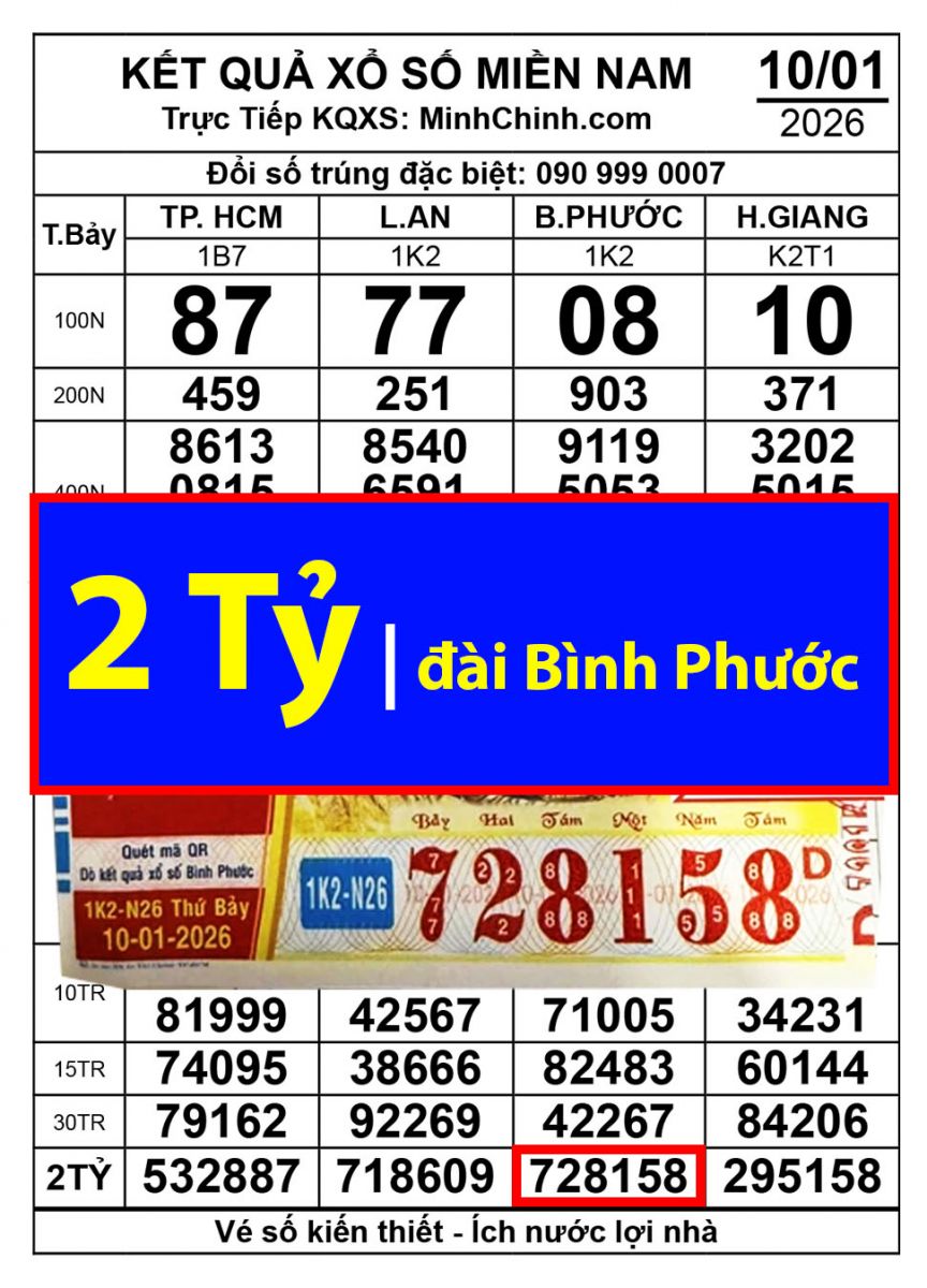 Cụ thể, trong kỳ mở thưởng xổ số miền Nam ngày 10/1, đài Bình Phước đã tìm ra tờ vé trúng độc đắc trị giá 2 tỉ đồng (chưa trừ thuế) với dãy số 728158. Thông tin này được chị Lê Thị Kim Thanh, chủ đại lý vé số Rô Thanh (Tây Ninh), xác nhận khi trực tiếp đổi thưởng cho khách trúng.