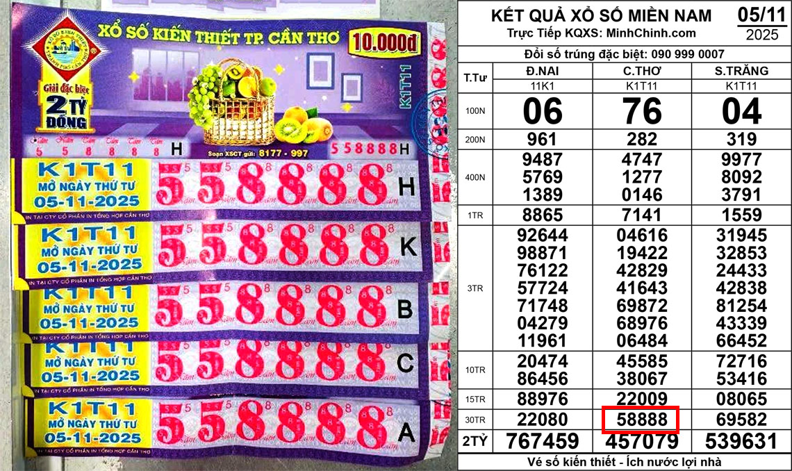 Ngày 5/11/2025, cộng đồng yêu vé số miền Nam xôn xao trước thông tin một tờ vé có trúng giải nhất của đài dãy tứ quý 8888 Cần Thơ. Tấm vé may mắn này mang dãy số 558888, được xác nhận trúng thưởng 150 triệu đồng (chưa trừ thuế).