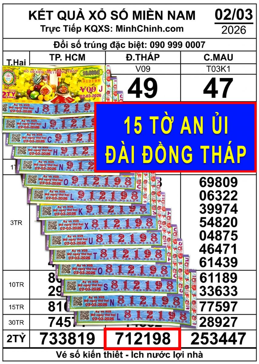 Cùng kỳ mở thưởng, vé số Đồng Tháp có dãy số đặc biệt 712198, được xác định trúng tại tỉnh An Giang.