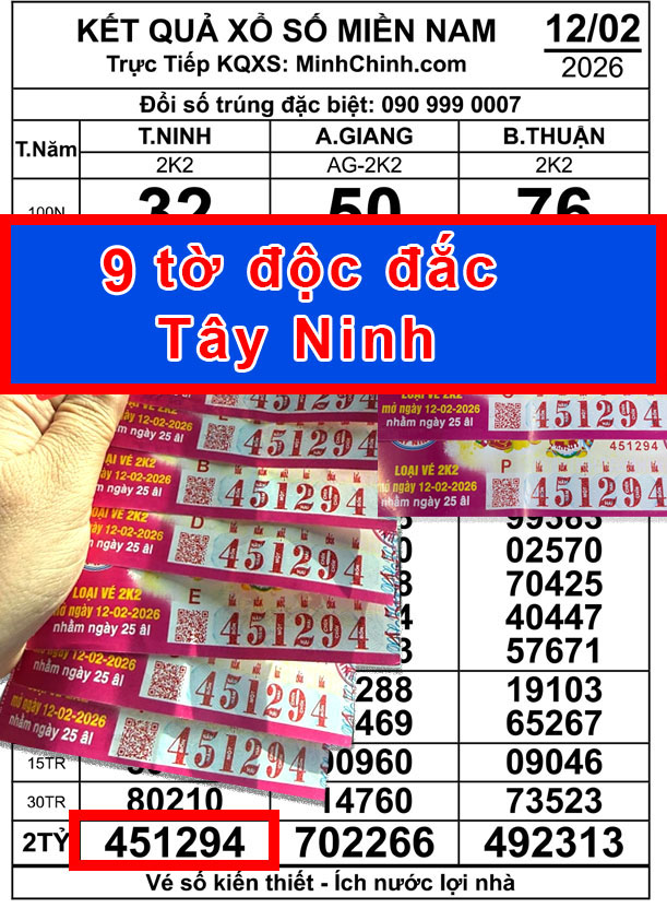 Cùng ngày mở thưởng, vé số Tây Ninh xác định dãy số trúng độc đắc là 451294 và được ghi nhận trúng ngay tại tỉnh Tây Ninh.