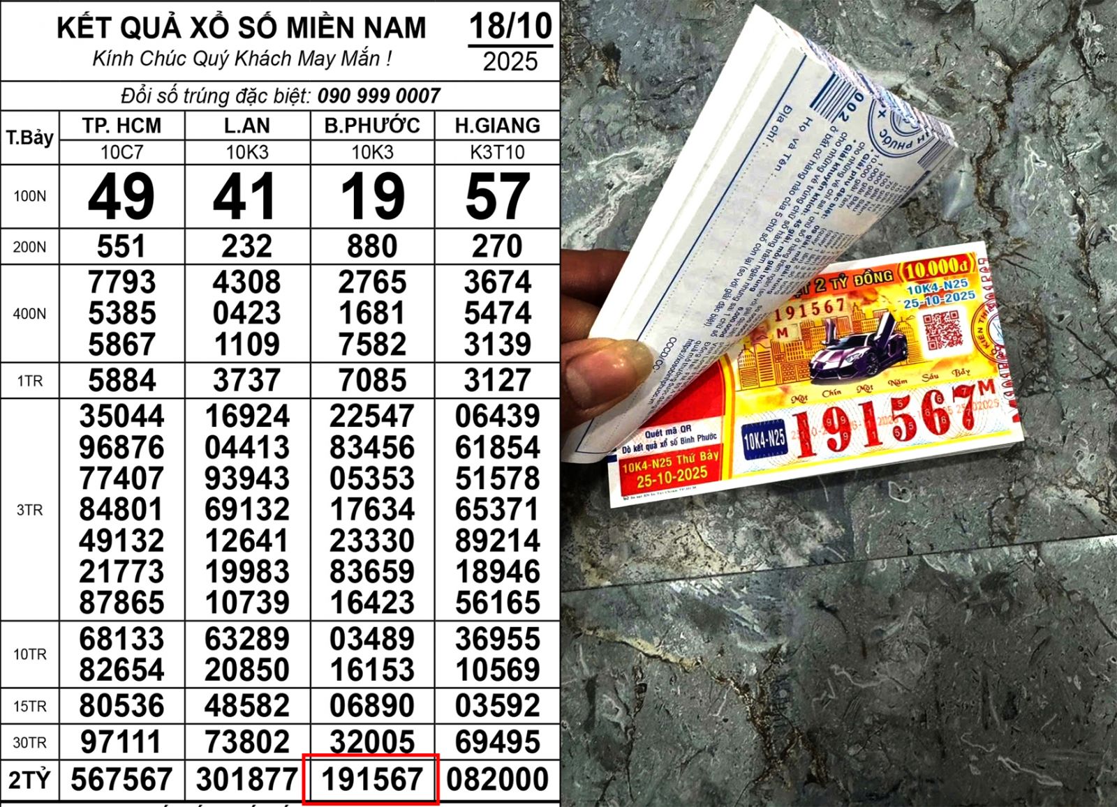 Theo anh Khắc Duy, chủ đại lý vé số Khắc Duy (Vĩnh Long – Bến Tre cũ), toàn bộ 140 tờ vé số trúng thưởng thuộc đài Bình Phước mở thưởng ngày 18/10, trong đó dãy số trúng giải đặc biệt là 191567.
