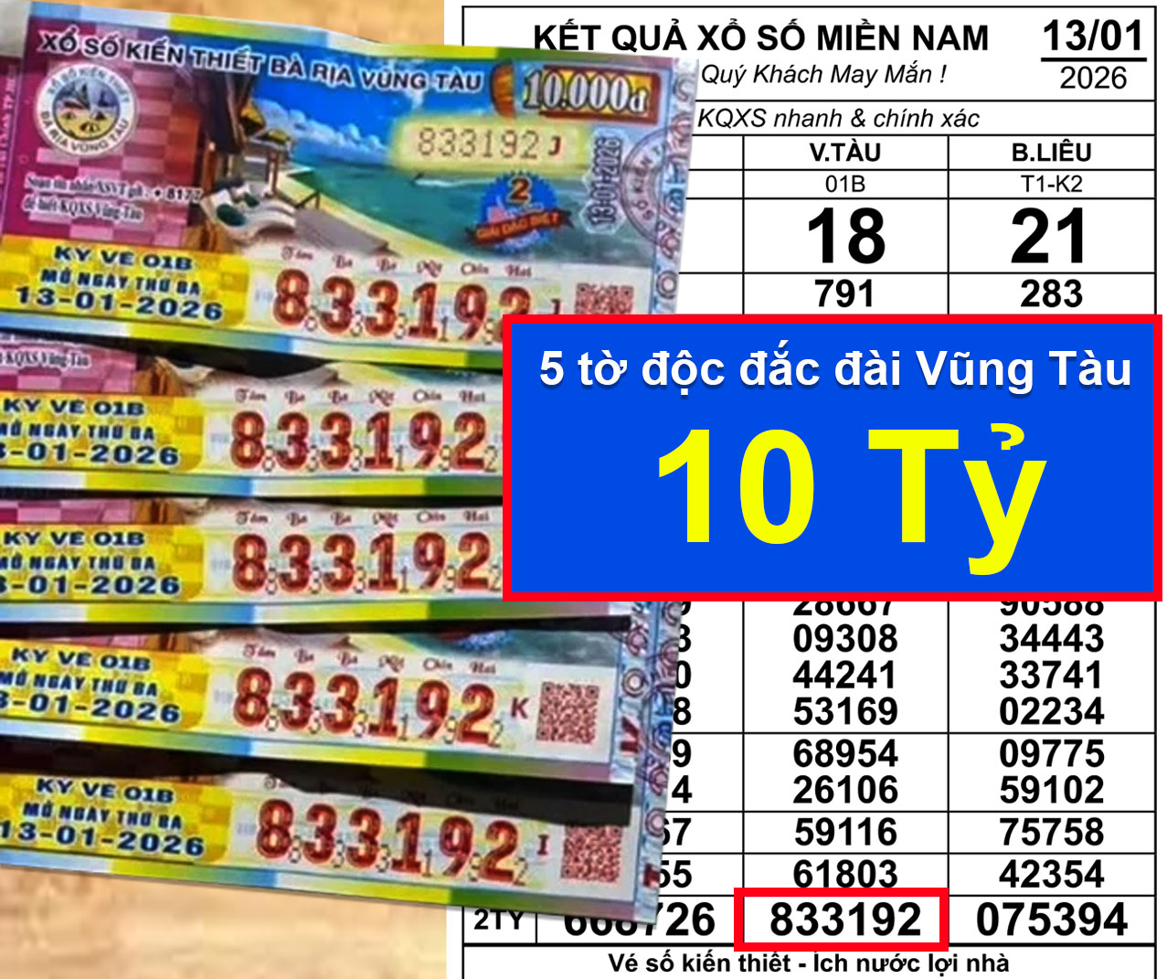 Cụ thể, giải độc đắc của vé số Vũng Tàu với dãy số 833192, mở thưởng chiều 13-1, đã được xác định trúng tại tỉnh Tây Ninh. Theo thông tin từ đại lý, một khách hàng đã mang 5 vé trúng độc đắc đến đổi thưởng tại đại lý vé số Thanh Khoa (Lộc), thuộc xã Bến Cầu, tỉnh Tây Ninh. Hiện vẫn còn 9 vé trúng độc đắc Vũng Tàu chưa đến nhận thưởng, và đại lý đang thông báo để chủ nhân sớm hoàn tất thủ tục đổi vé theo quy định.