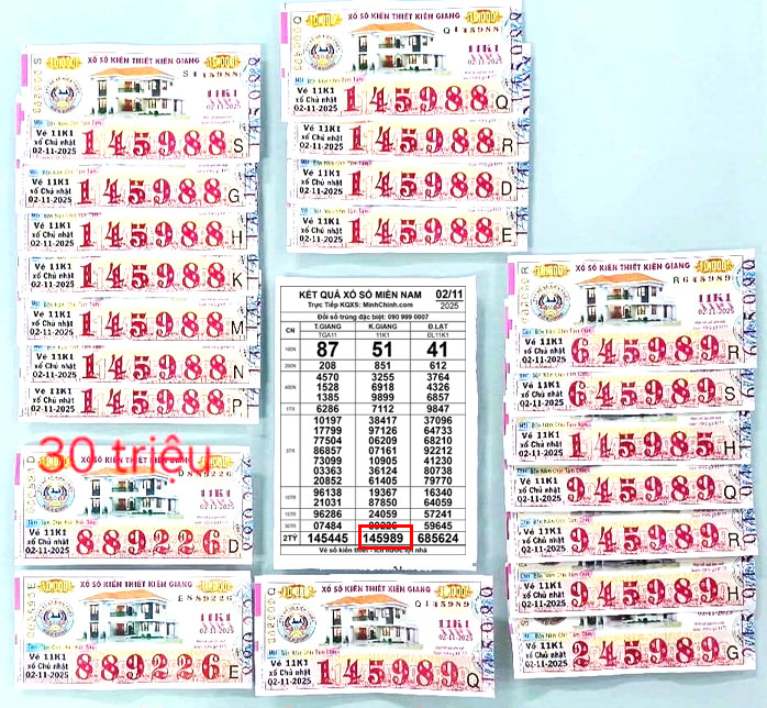 Với kỳ mở thưởng ngày 2-11, đại lý vé số Chấn Nam (phường Vị Thanh, TP Cần Thơ) xác nhận đã đổi thưởng 1 tờ trúng giải đặc biệt (dãy số 145989) của Công ty Xổ số kiến thiết Kiên Giang.