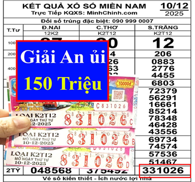 Theo thông tin từ đại lý vé số cấp 1 Trường Thịnh (Cà Mau), đơn vị vừa thực hiện đổi thưởng cho 3 tờ vé trúng giải an ủi của đài Sóc Trăng. Những tờ vé đều mang dãy số 831026, với tổng giá trị 150 triệu đồng (chưa trừ thuế). Trong khi đó, giải độc đắc chiều nay của đài Sóc Trăng thuộc về dãy số 331026.