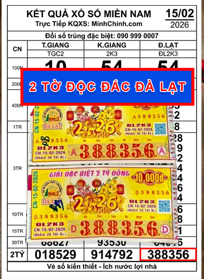 Vé số Đà Lạt mở thưởng chiều 15-2 xác định dãy số trúng giải độc đắc là 388356.
