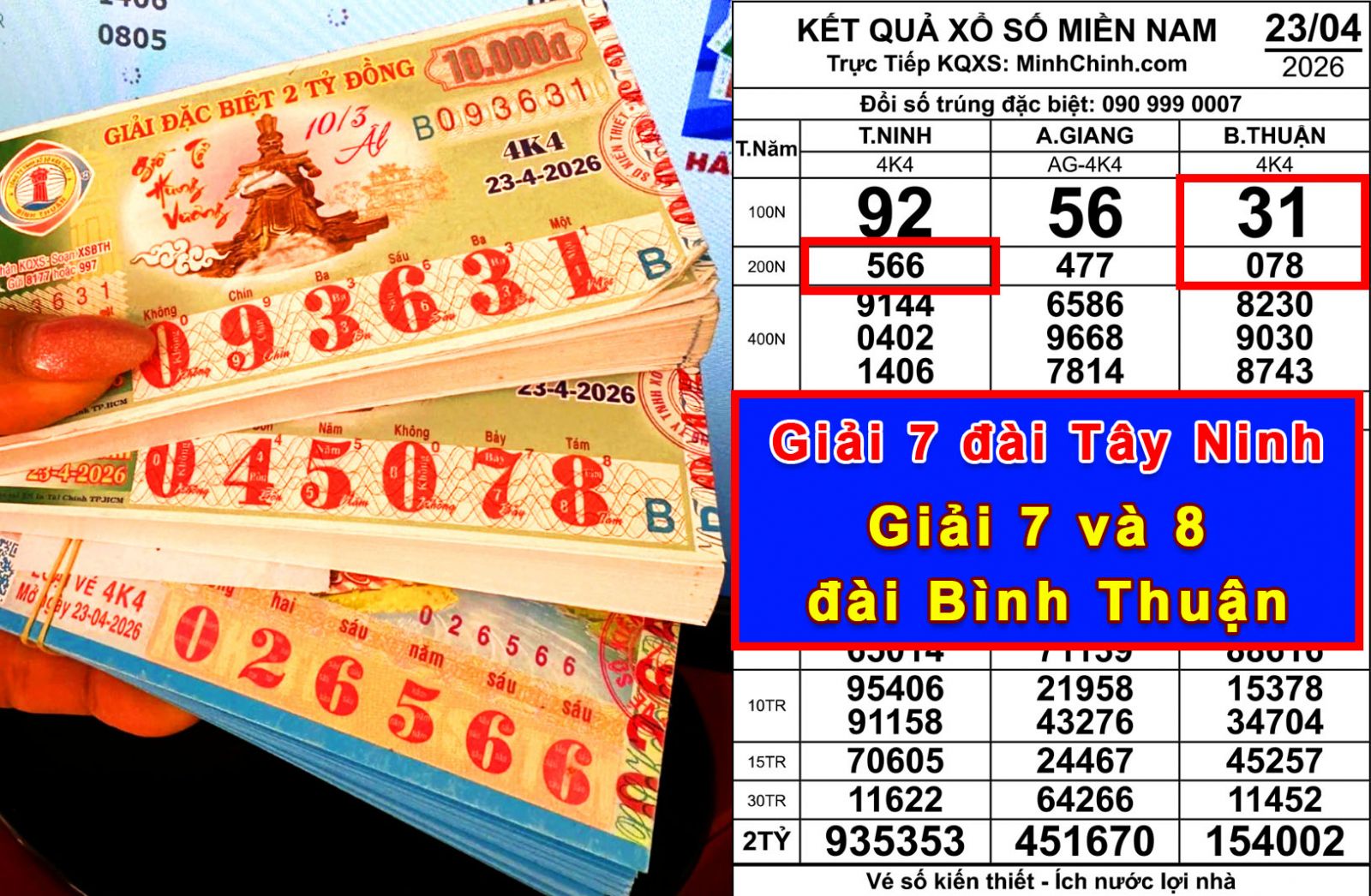 Trong kỳ mở thưởng ngày 23/4, xổ số miền Nam quay 3 đài gồm Tây Ninh, An Giang và Bình Thuận. Dãy số trúng độc đắc lần lượt là 935353 đối với Tây Ninh, 451670 đối với An Giang và 154002 đối với Bình Thuận.