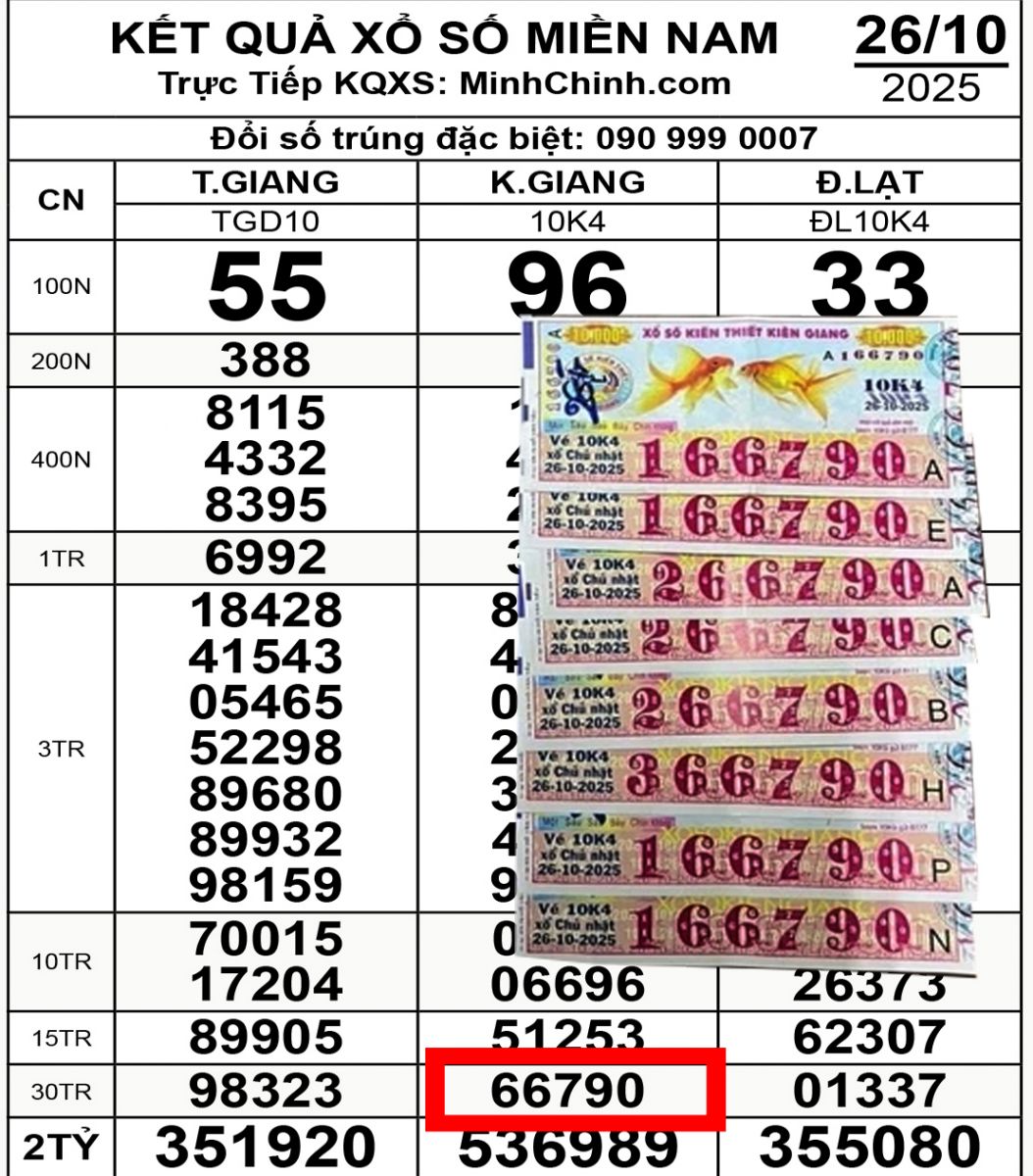 Đại lý vé số Triều Phát tại An Giang (Kiên Giang cũ) xác nhận vừa đổi thưởng 8 tờ trúng giải nhất theo kết quả xổ số Kiên Giang ngày 26/10.