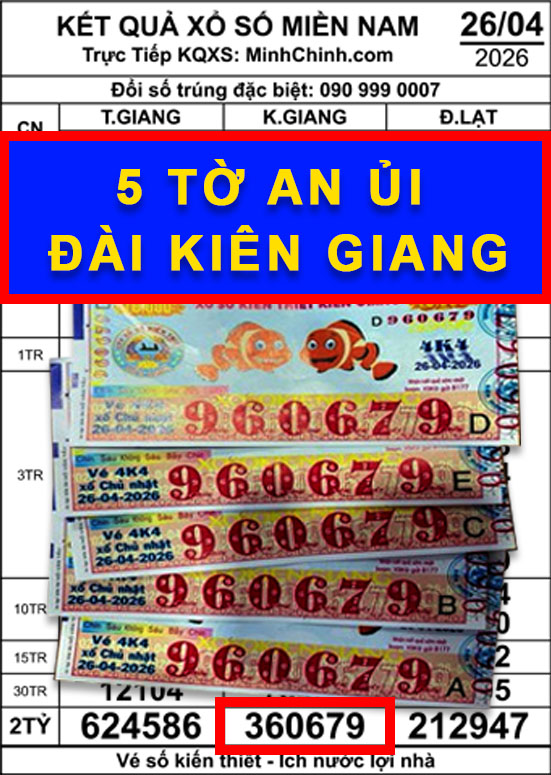 Kết quả xổ số miền Nam ngày 26/4 quay 3 đài gồm Tiền Giang, Kiên Giang và Đà Lạt. Dãy số độc đắc lần lượt là 624586 đối với Tiền Giang, 360679 đối với Kiên Giang và 212947 đối với Đà Lạt.