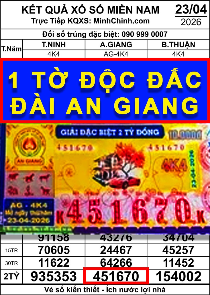 Theo thông tin từ đại lý vé số Phú Vinh, tờ vé may mắn có dãy số 451670 thuộc đài An Giang mở thưởng ngày 23/4 đã trúng giải độc đắc trị giá 2 tỉ đồng, chưa trừ thuế.