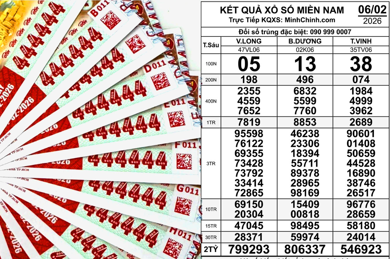 Kết quả xổ số miền Nam ngày 6-2 ghi nhận nhiều dãy số có hình thức đặc biệt như 020304 và 131313, thu hút sự quan tâm của người chơi xổ số và các đại lý vé số tại nhiều địa phương.