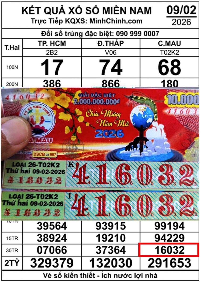 Theo chia sẻ từ đại lý vé số Thảo Minh (Lâm Đồng), ngay sau khi có kết quả quay số chiều 9-2, đại lý đã tiến hành đổi thưởng cho 2 tờ vé số trúng giải nhất xổ số Cà Mau, với dãy số cuối 16032. Mỗi vé trúng giải nhất có giá trị 30 triệu đồng, giúp người trúng thưởng có thêm nguồn tài chính trong thời điểm cận Tết.