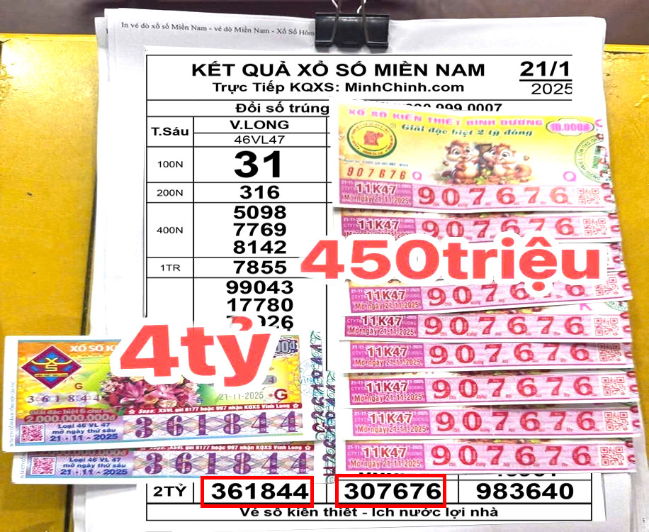 Sáng 22/11, đại lý vé số Phương Nghi tại xã Bà Điểm (TP HCM) xác nhận đã đổi thưởng ngay trong đêm cho một khách hàng trúng 2 tờ vé số Vĩnh Long, dãy số 361844, do Công ty TNHH MTV Xổ số kiến thiết Vĩnh Long mở thưởng.
