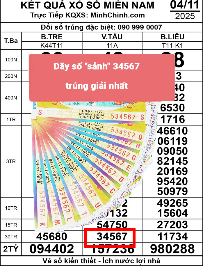 Đáng chú ý, mạng xã hội còn lan truyền thông tin về 140 tờ vé số Vũng Tàu có dãy số “sảnh” 34567 trúng giải nhất trị giá 30 triệu đồng mỗi vé tại khu vực Củ Chi. Dãy số này được xem là “độc lạ”, hiếm người chọn mua, nhưng lại bất ngờ mang về số tiền thưởng lớn.