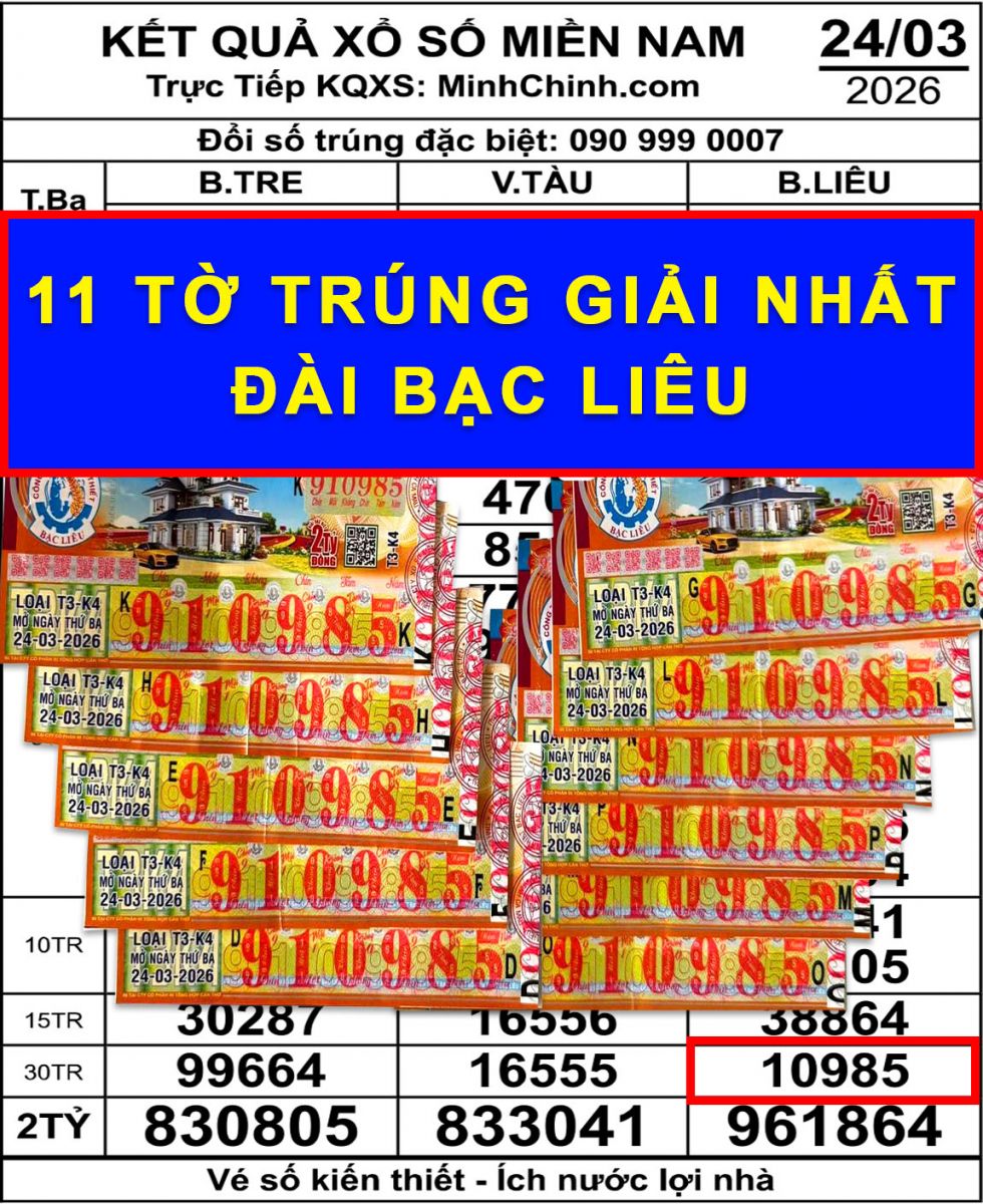 Theo ghi nhận, vé số Bạc Liêu (961864) mở thưởng ngày 24-3:
